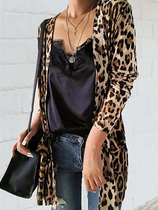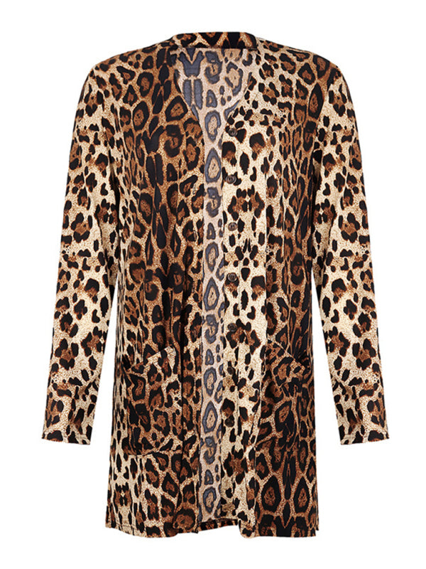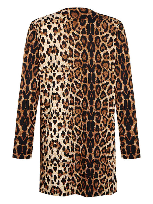 Women's Long Sleeve Leopard Print Cardigan Mid Length Coat