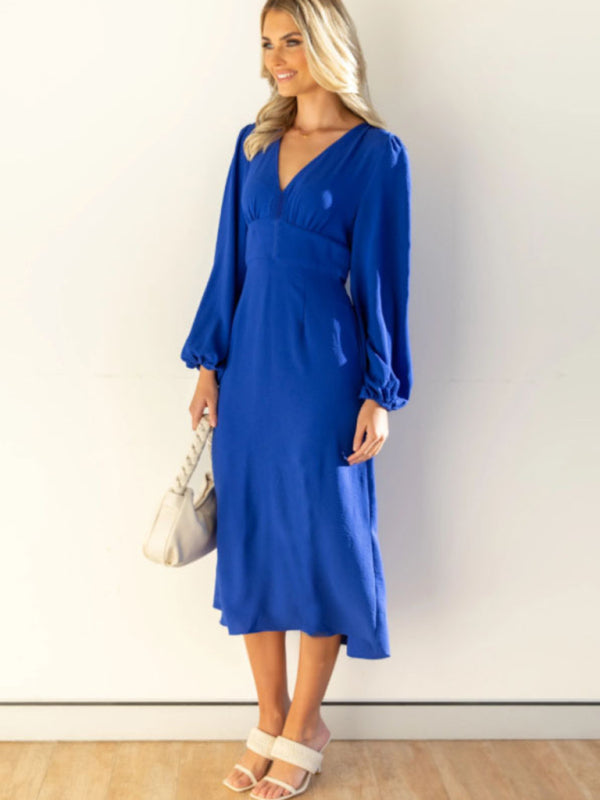 Women’s Dramatic V Neck Maxi Dress With Long Straight Skirt And Loose Puff Sleeves - Blue / S is backordered and will ship as soon as it is back in stock.