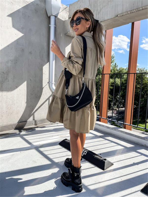 Women's Solid Color Pointed Collar Long Sleeve Button-front Tiered Mini Dress