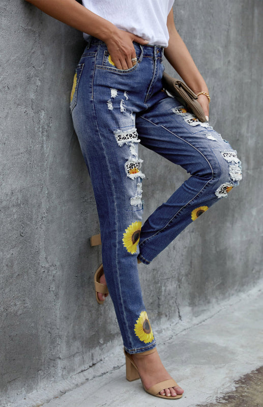 Leopard Patchwork Sunflower Print Distressed High Waist Jeans