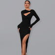 Women’s Long Sleeve Angled Neckline Dress With Front Cutouts And Leg Slit - Black / S is backordered and will ship as soon as it is back in stock.