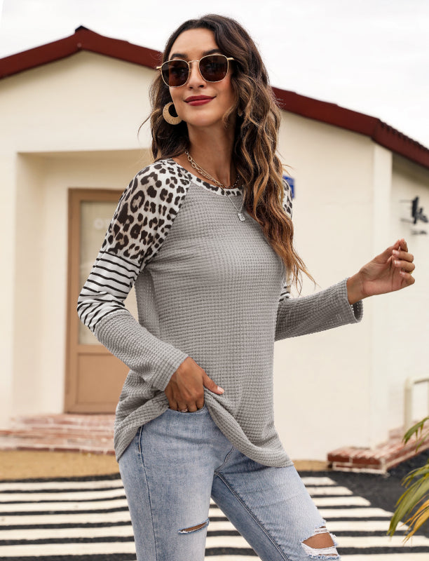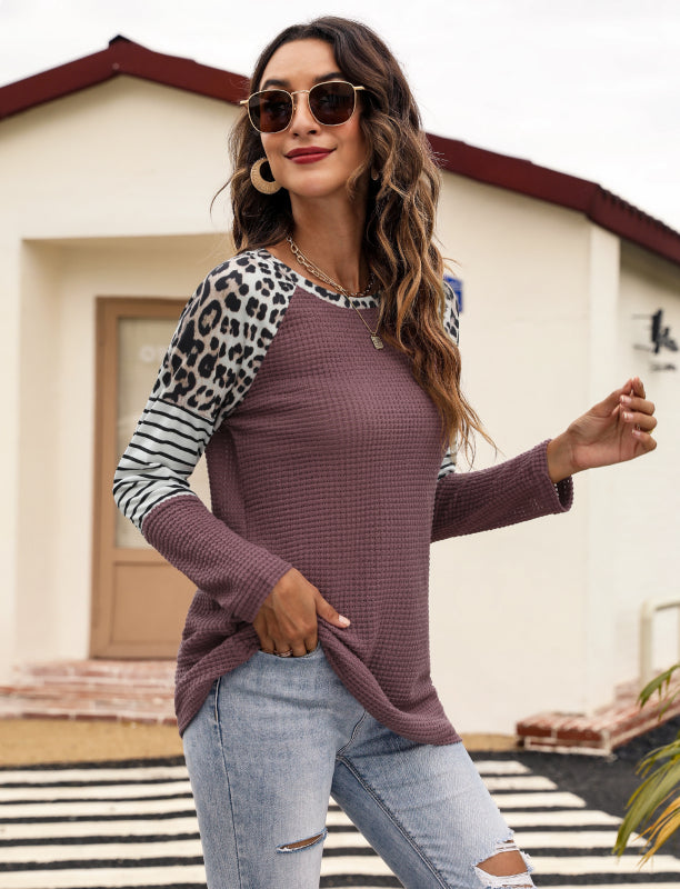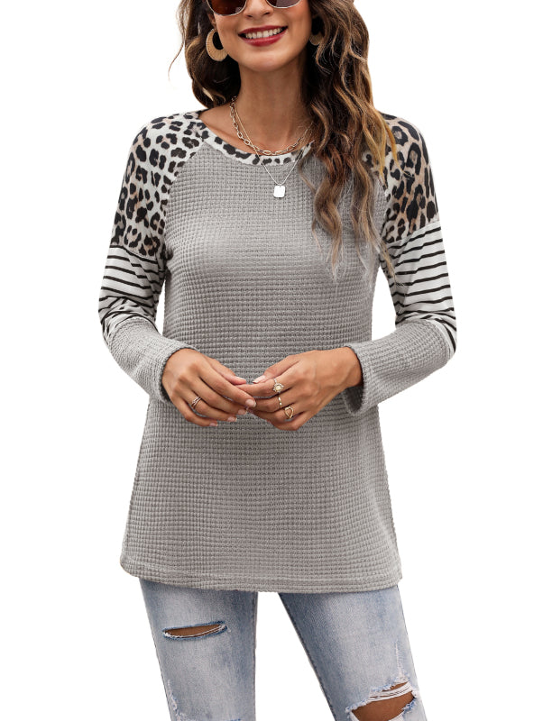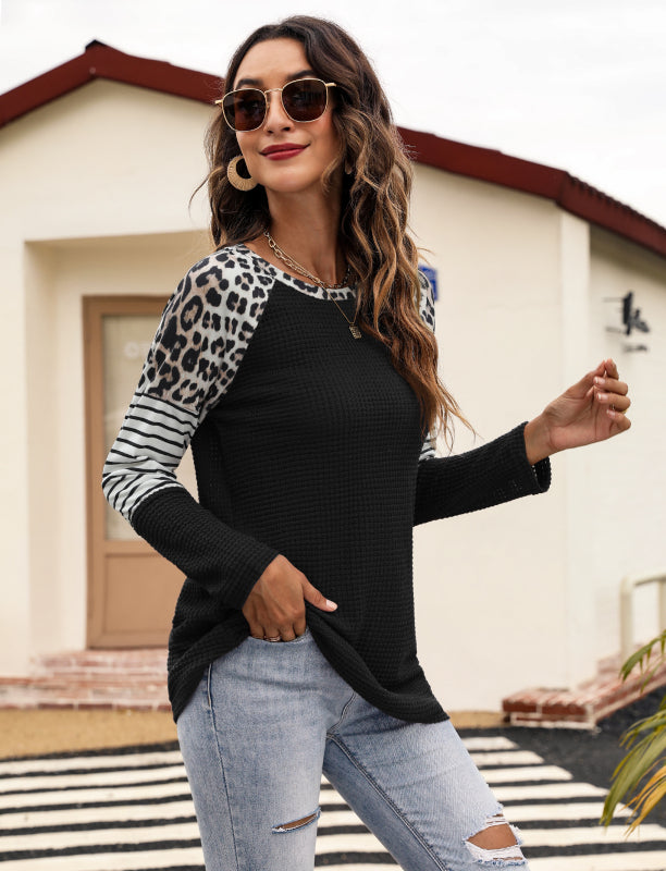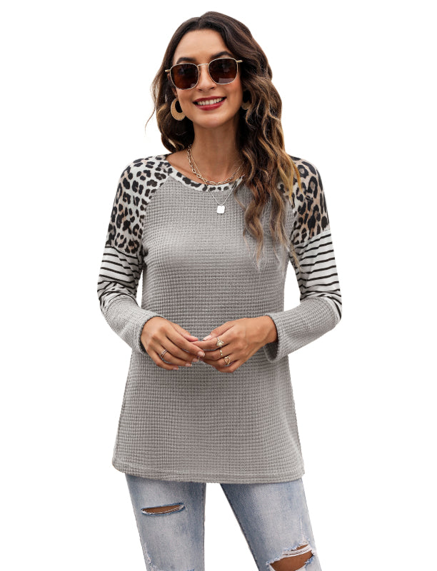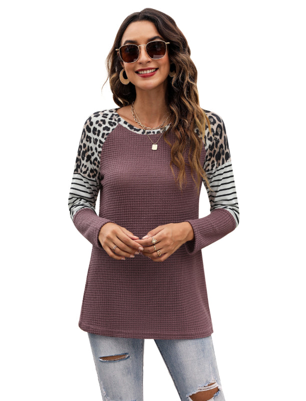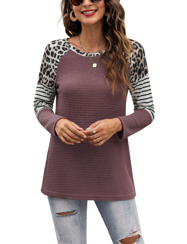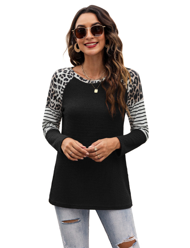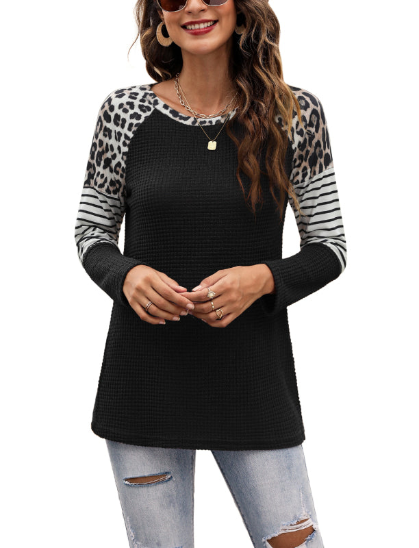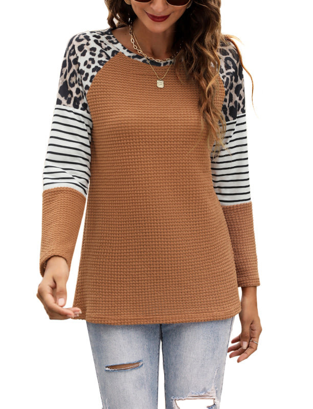 Women’s Long Sleeve Waffle Sweater With Leopard And Stripe Color Blocking