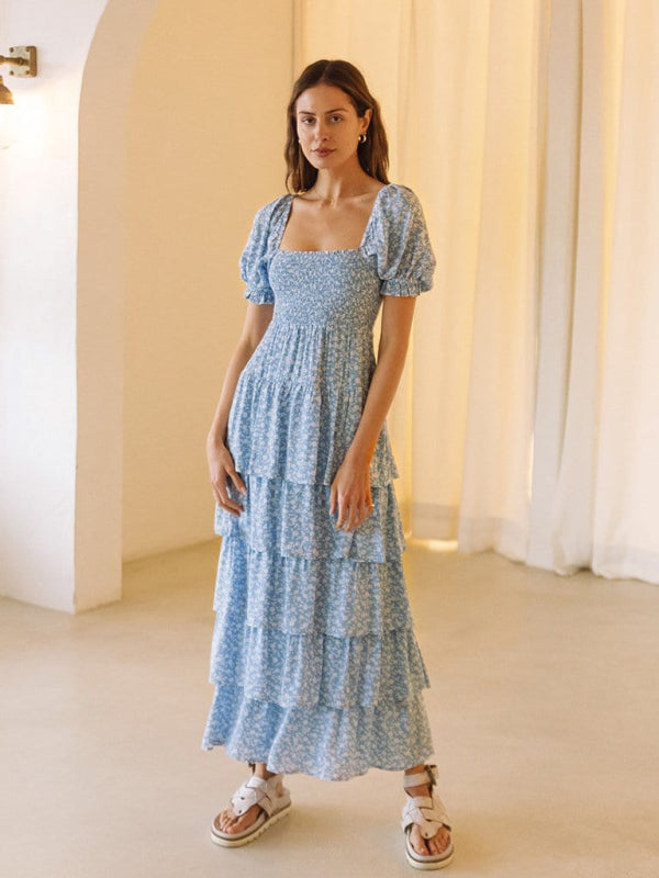So pretty and femme, this maxi dress is featured in a longline tiered silhouette for the perfect, effortless look. Fitted with a smocked bust and a flowy skirt and billowing, puffy sleeves,