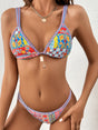 Jumbled bright prints tumble across a triangle bikini top and bikini bottoms that don't need to spell things out for you to know where it's from.