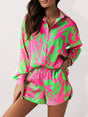 Women's Bright Printed Long Sleeve Notch Collar Top And Short Set - Green / S is backordered and will ship as soon as it is back in stock.