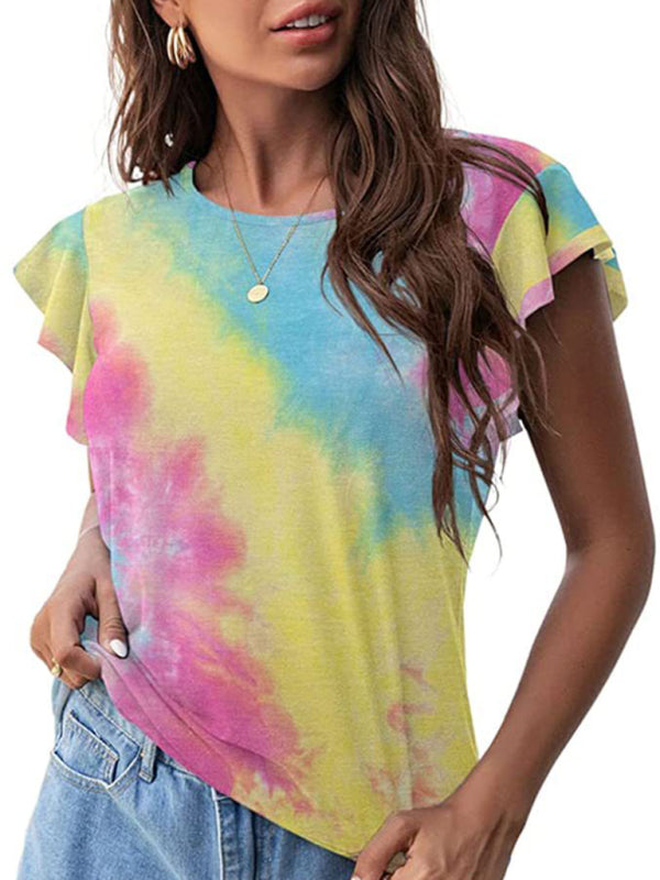 Women's casual round neck printed lotus leaf short-sleeved T-shirt