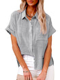 Women's Solid Color Short Sleeve Button-front Top - Grey / S is backordered and will ship as soon as it is back in stock.