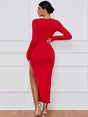 Turn heads on your next night out in this figure-flattering twist cutout long-sleeve high-slit maxi dress, adorned with angular cutouts and soft gathers along the waist with a high slit.