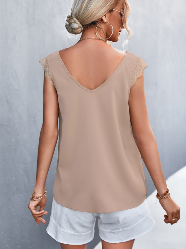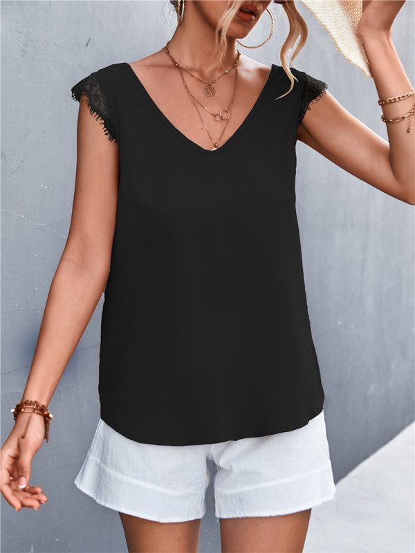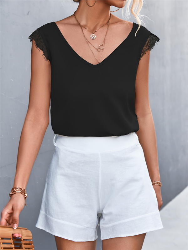 Women's Solid Color V-neck Lace Trim Top - White / S is backordered and will ship as soon as it is back in stock.