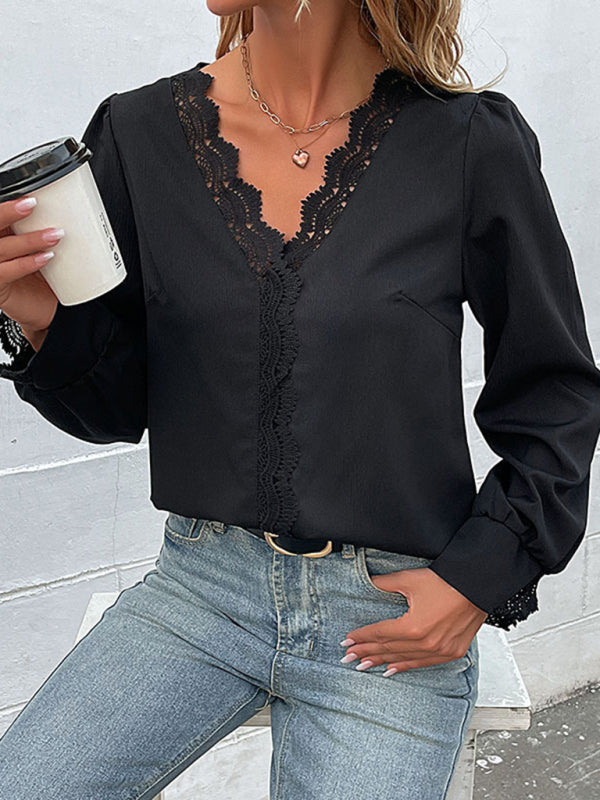 Women's Solid Color V-neck Long Sleeve Lace Trim Top