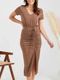 Women's Solid Color V Neck Short Sleeve Drawstring Slit Dress - Coffe / S is backordered and will ship as soon as it is back in stock.