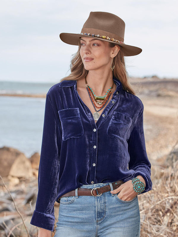 Women's Solid Color Velvet Button-up Shirt - Olive green / S is backordered and will ship as soon as it is back in stock.