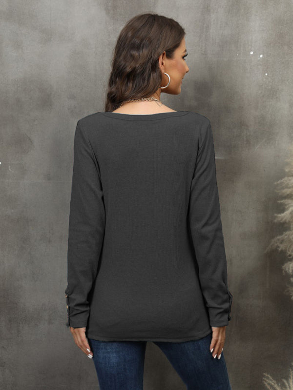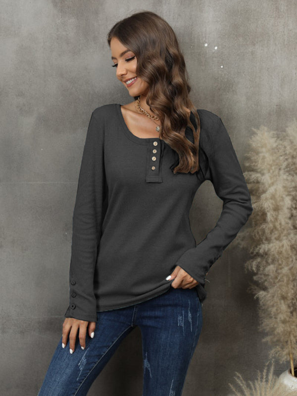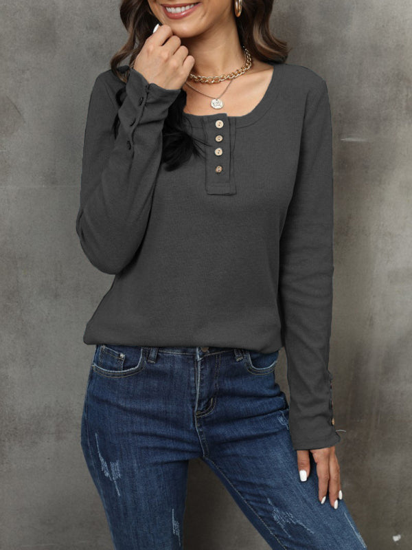 Women's Solid Color Waffle Knit Long Sleeve Henley Top