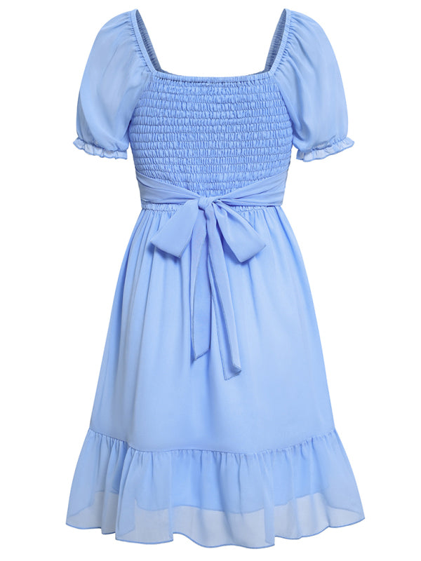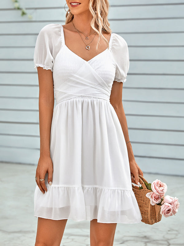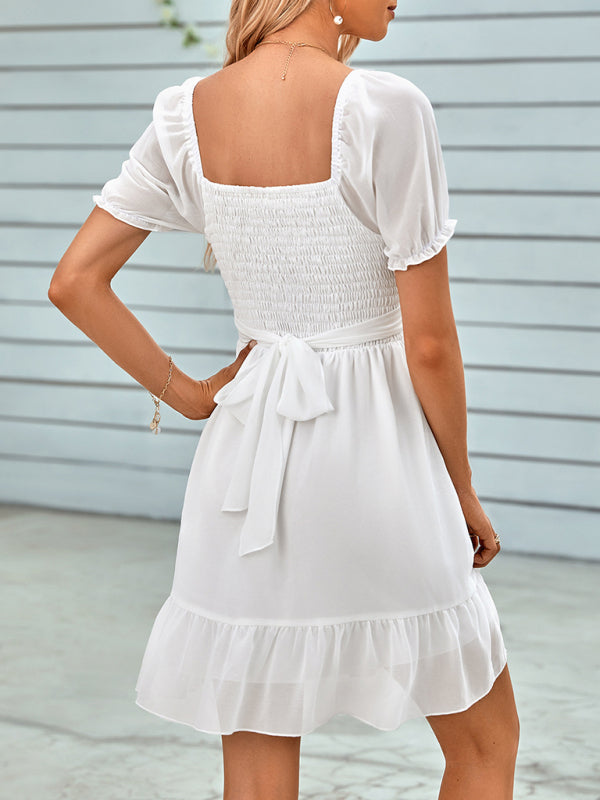 Women's spring and summer V-neck solid color waist short-sleeved dress