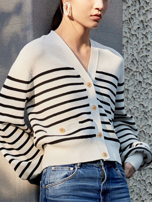 Women's Striped Gold Button Cardigan V-Neck Knit Jacket