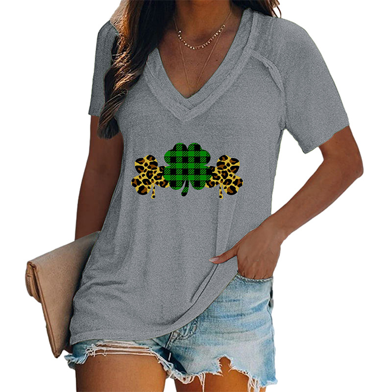 Women's V-neck Graphic Printed Four-leaf Clovers T-shirt - Misty grey / S is backordered and will ship as soon as it is back in stock.