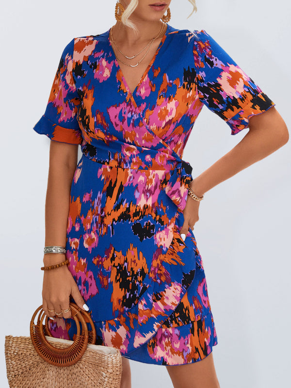 Women's Woven V Neck Ruffle Wrap Short Sleeve Dress