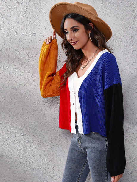 Women's contrast color knitted cardigan Color Matching short sweater