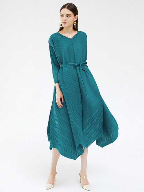 $45.79 USDUnit price /UnavailableWomen’s V Neck Faux-wrap Styling With Belt At Waist Maxi Pleated Long Sleeve Dress