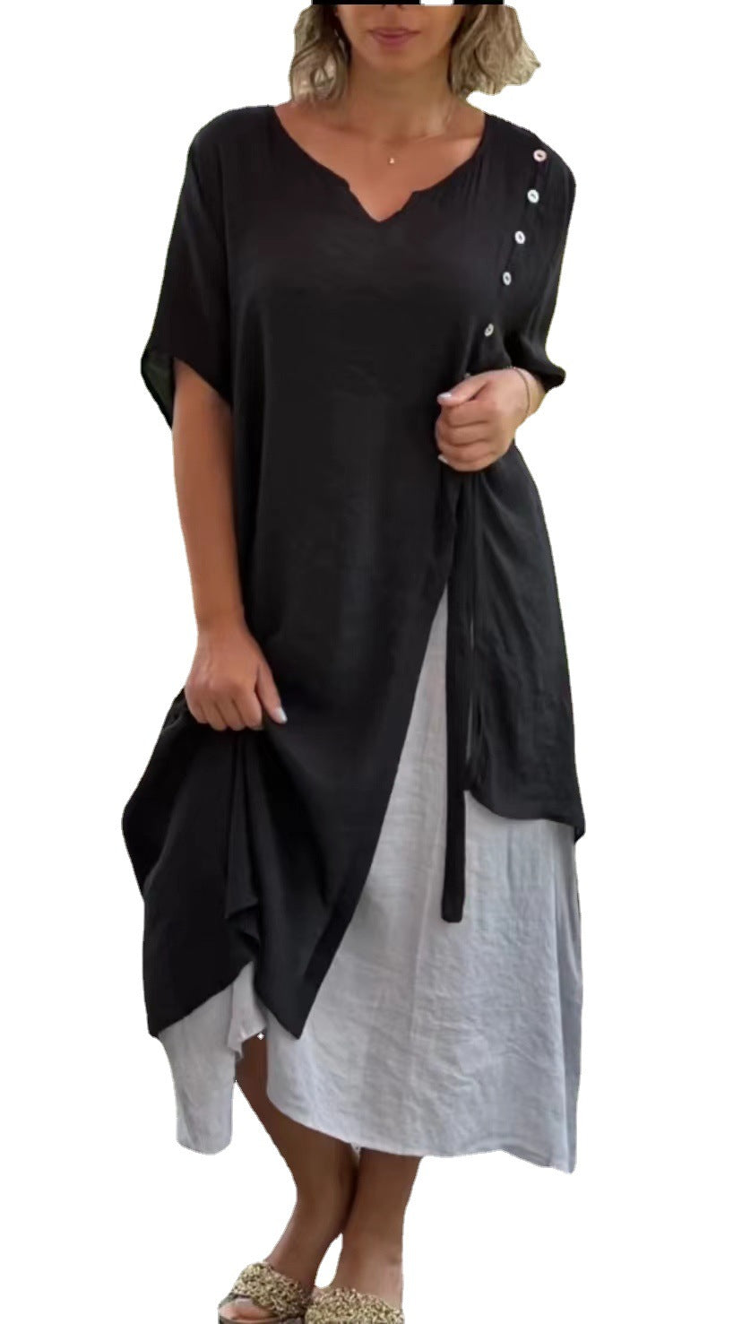 Women V neck Short Sleeve Faux Two Piece Asymmetric Dress Spring Summer - S / Black is backordered and will ship as soon as it is back in stock.
