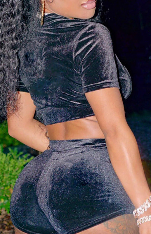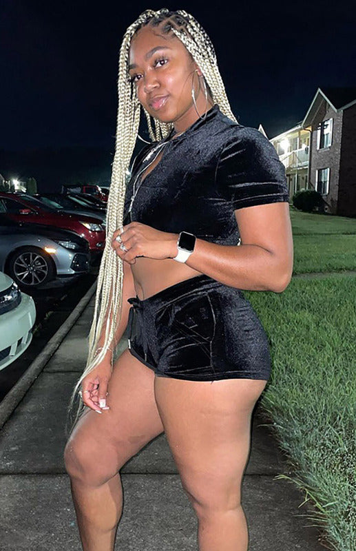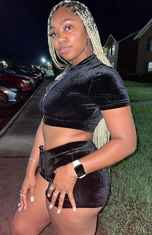 Ladies Velvet Short Solid Color Casual Sexy Two-piece Set