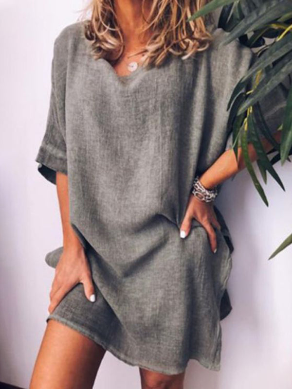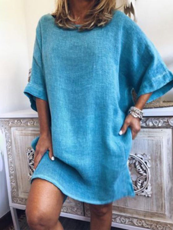 Summer new casual cotton linen solid color hem slit dress