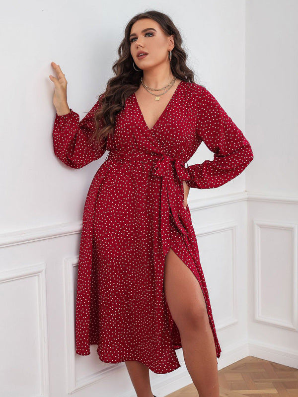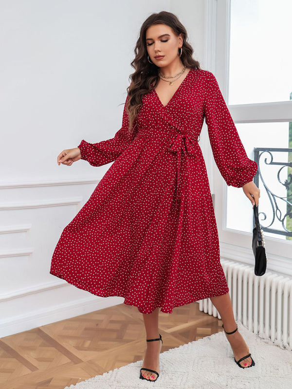 Women's Plus Size Dot Print Puff Sleeve Tie Waist V Neck Wrap Midi Dress