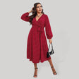 Women's Plus Size Dot Print Puff Sleeve Tie Waist V Neck Wrap Midi Dress - Red / XL is backordered and will ship as soon as it is back in stock.
