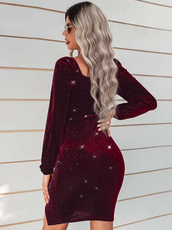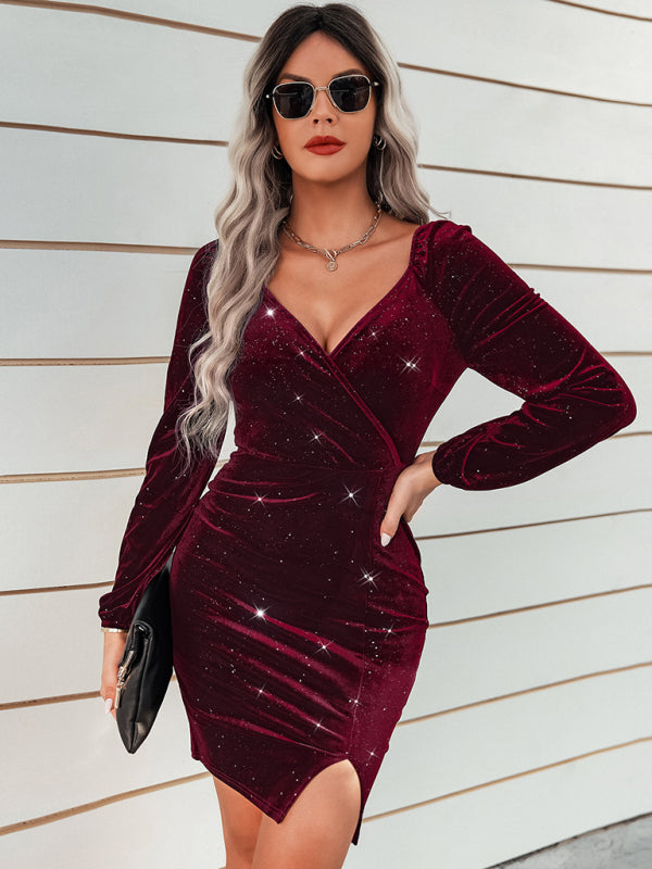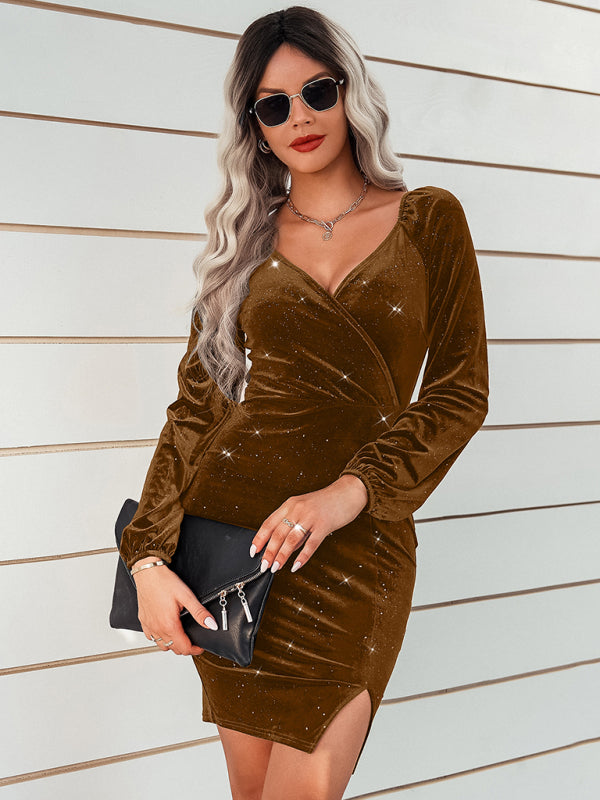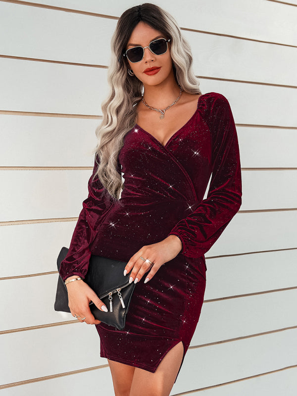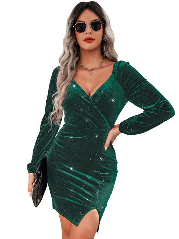 Women's sexy hip wrap skirt fashion V-neck velvet dress