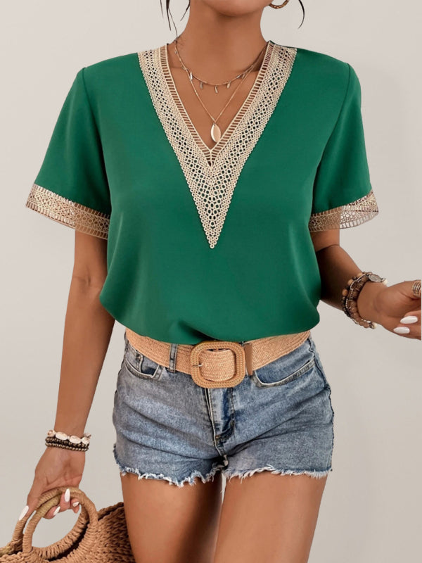 Crafted from a high-quality, lightweight fabric, this top ensures breathability and all-day comfort. Its solid color design allows for easy pairing with various bottoms, from jeans to skirts, for a wide range of looks. Elevate your style with this chic and timeless V-neck lace short-sleeved top.