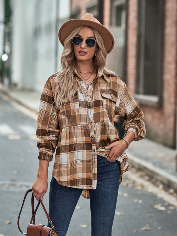 Women’s Babydoll Style Spread Collar Long Sleeves With Button Front Plaid Shirt Jacket - Orange plaid / S is backordered and will ship as soon as it is back in stock.