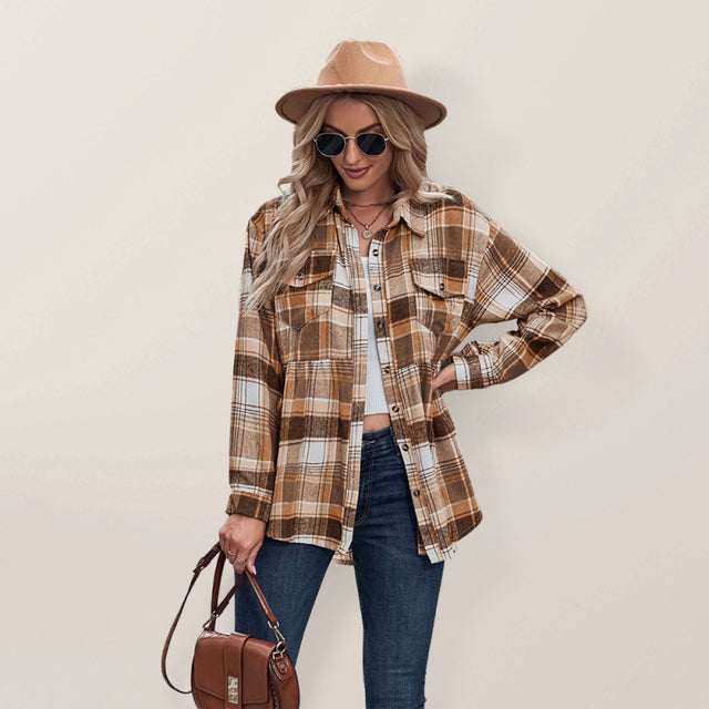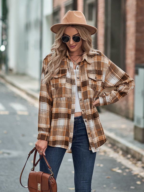 Women’s Babydoll Style Spread Collar Long Sleeves With Button Front Plaid Shirt Jacket