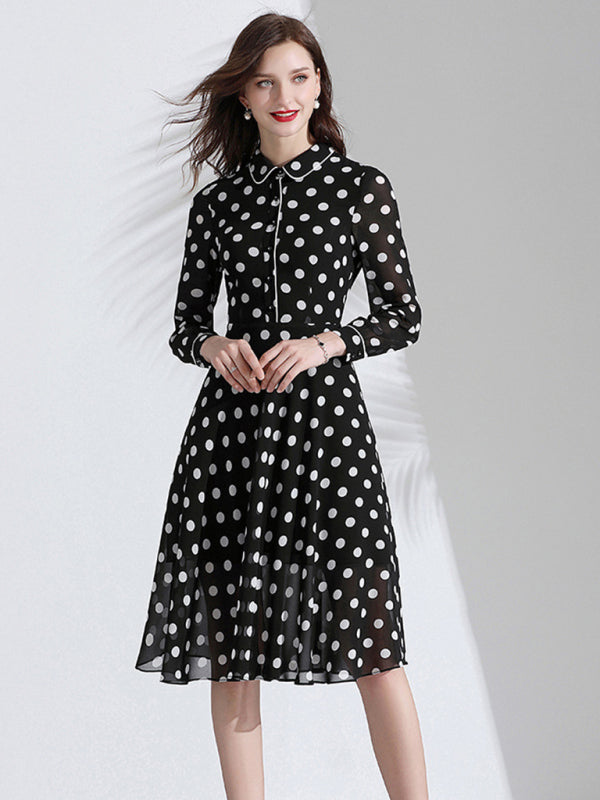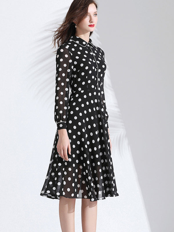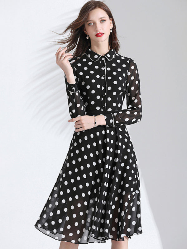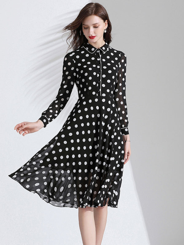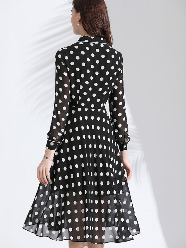 Women’s Classy Polka Dot Print Button Down Collared Cocktail Dress With Cuffed Sleeves