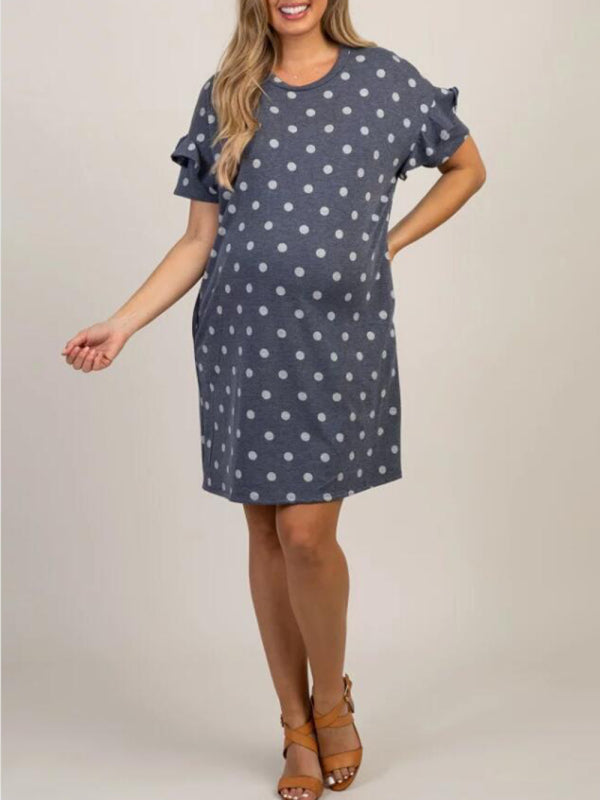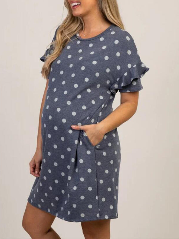 Maternity Knit Round Neck Polka Dot Ruffle Short Sleeve Dress