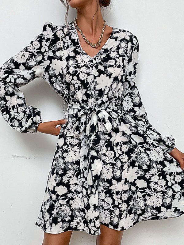 Women's Floral Print Long-sleeve Fit Waist Tie And Flare Dress