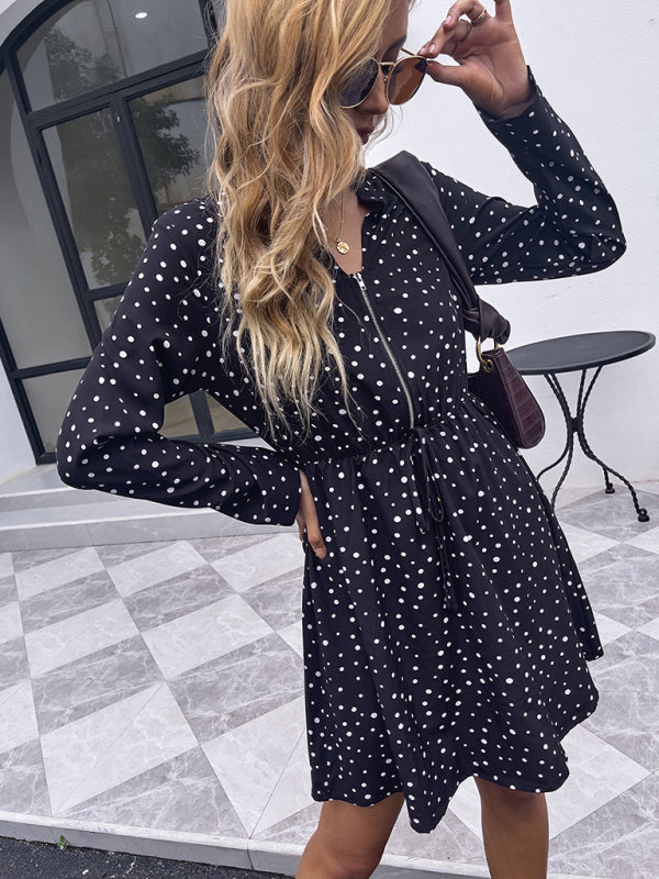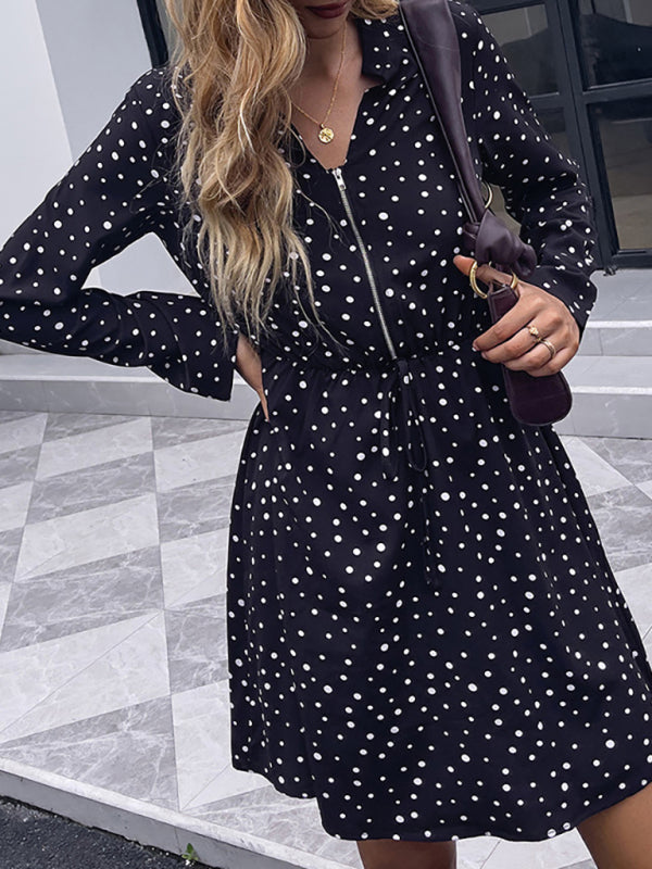 Woman'S Autumn Black Polka Dot Dress Lapel Casual Loose Long Sleeve Skirt