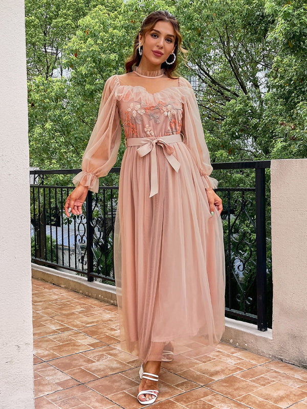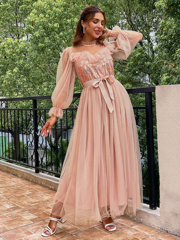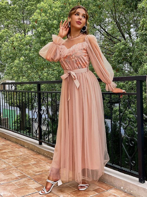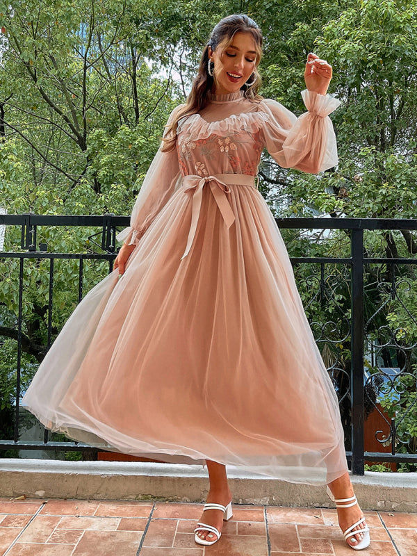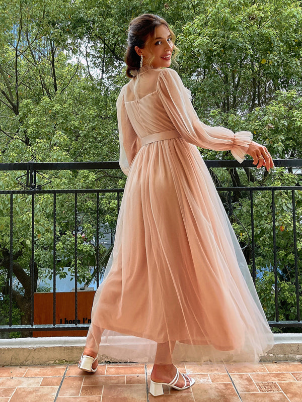 Women's Gauze Round Neck Puff Sleeve Dress - Pink / S está agotado y se enviará tan pronto como vuelva a estar disponible.