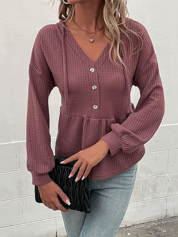 Women's knitted hooded V-neck waffle long-sleeved top - Red / S está agotado y se enviará tan pronto como vuelva a estar disponible.