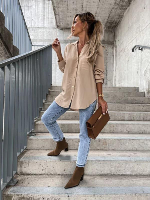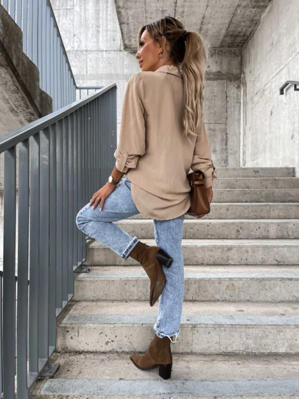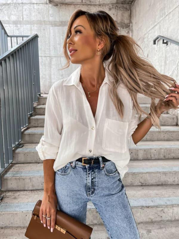 Women's new simple solid color pull-sleeve V-neck button lapel shirt
