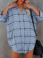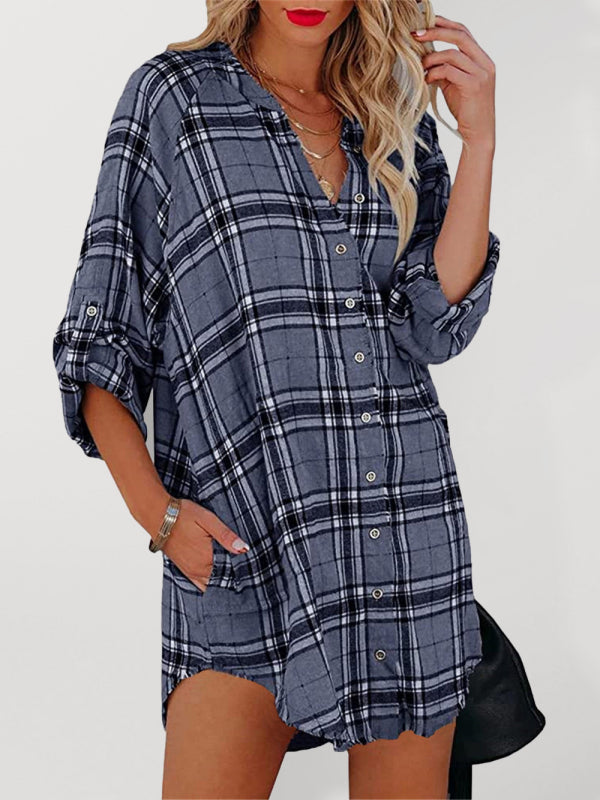 Women's plaid V-neck long-sleeved shirt dress - Mist blue / S está agotado y se enviará tan pronto como vuelva a estar disponible.