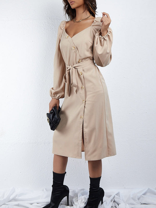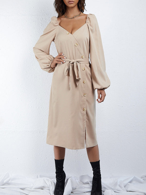 Women's Puff Sleeve V Neck With Button Side Down With Tie Dress - khaki / S está agotado y se enviará tan pronto como vuelva a estar disponible.