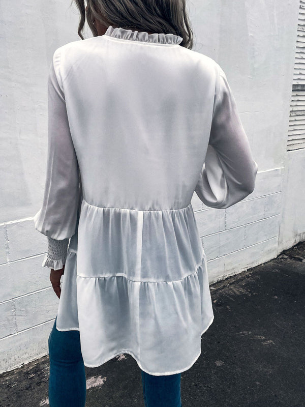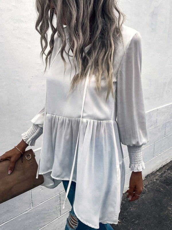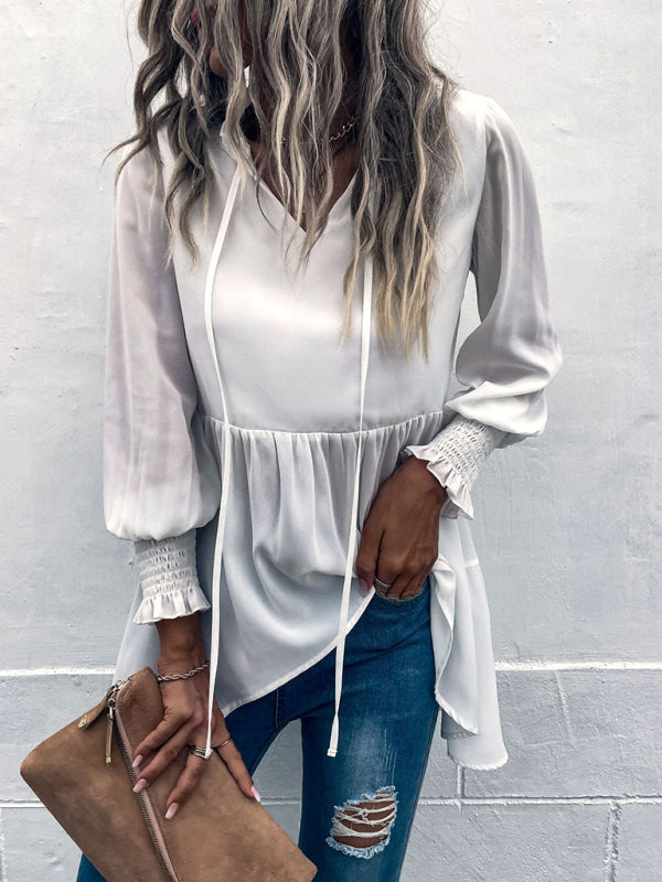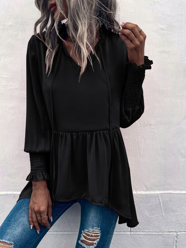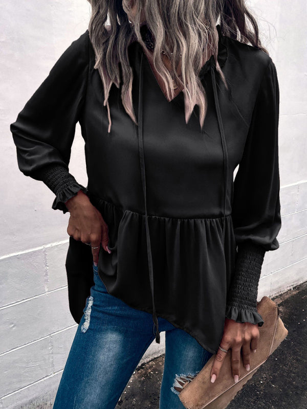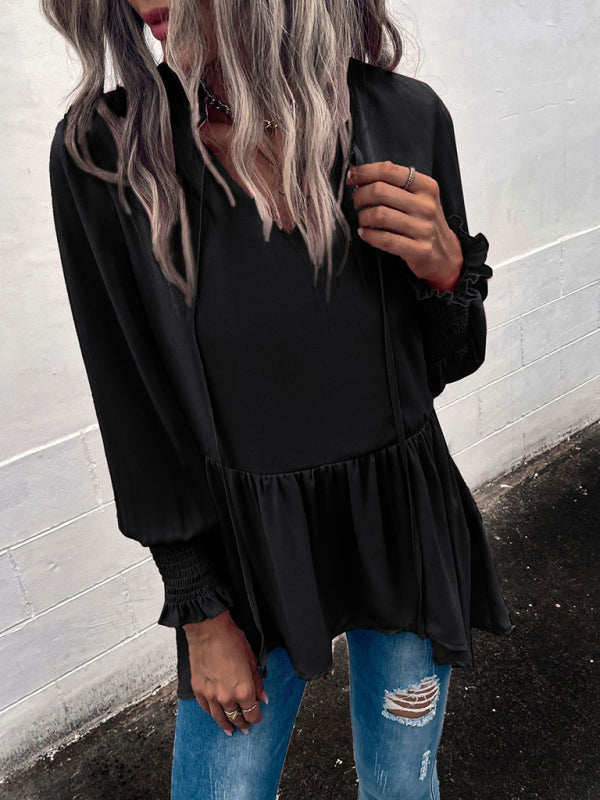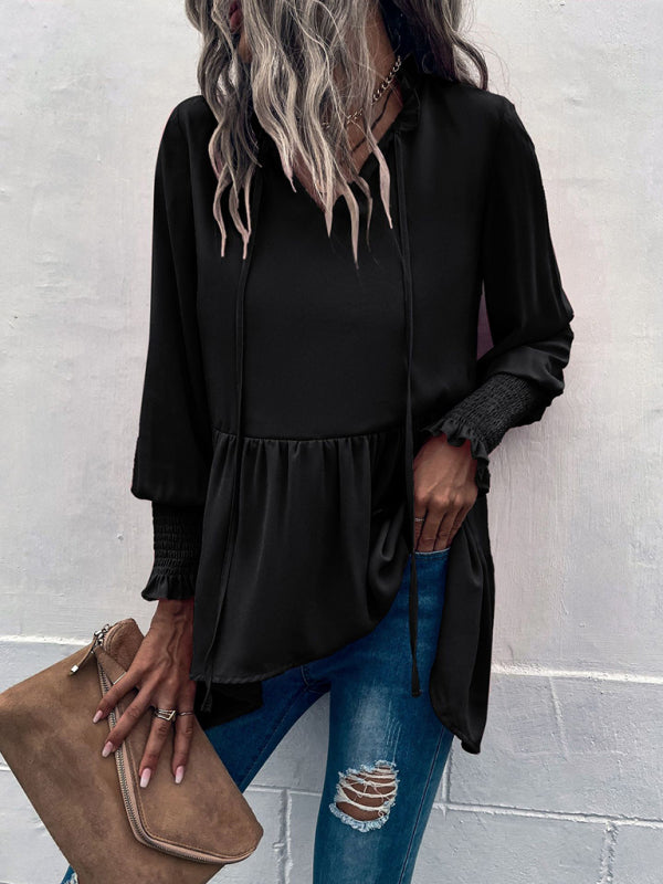 Women's V-Neck Tie Loose Long Sleeve Top - Black / S está agotado y se enviará tan pronto como vuelva a estar disponible.