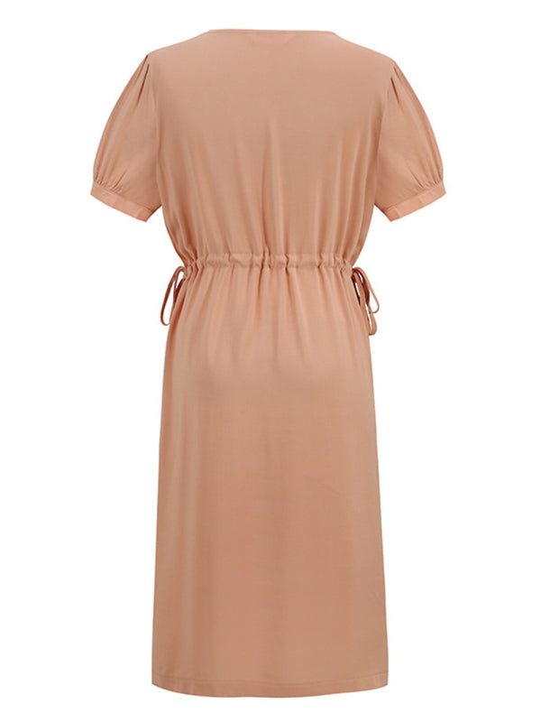 Maternity Drawstring Waist Short Sleeve Button Dress