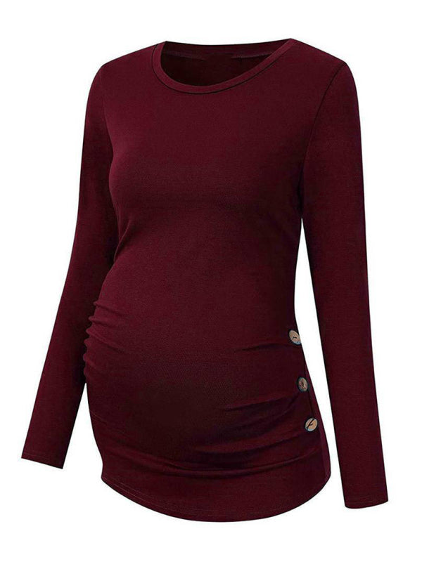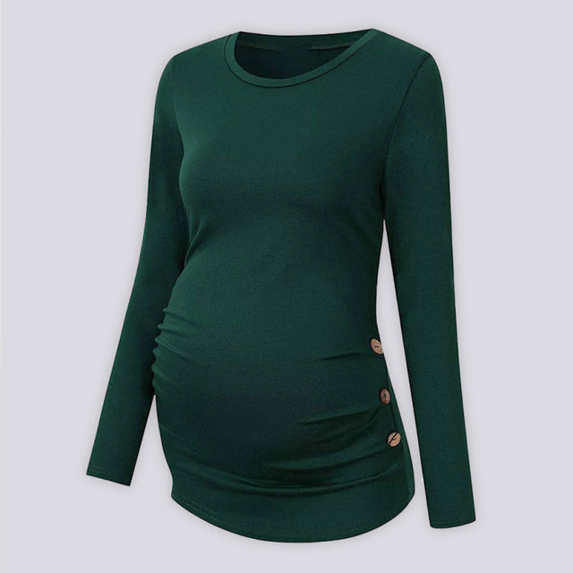 Maternity round neck button long sleeve pleated T-shirt - Green / S está agotado y se enviará tan pronto como vuelva a estar disponible.