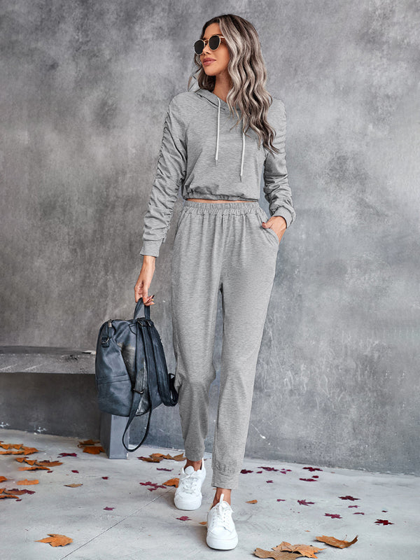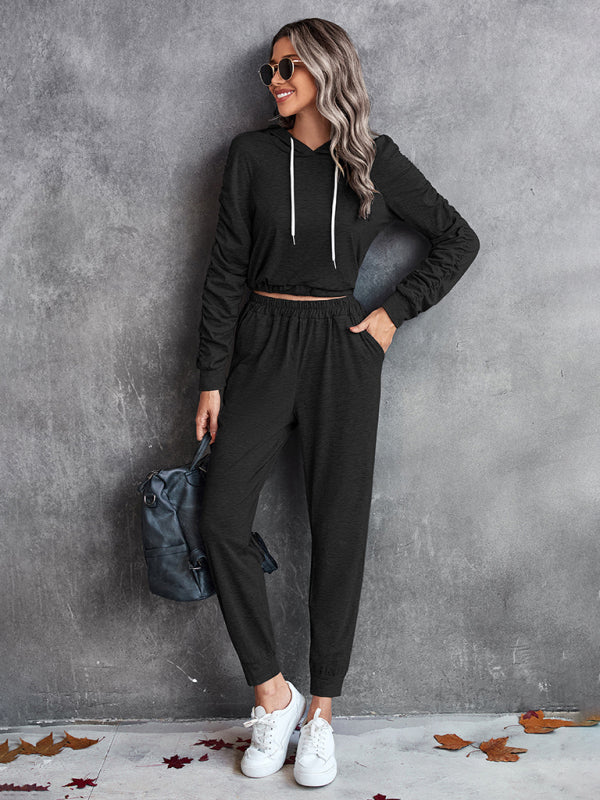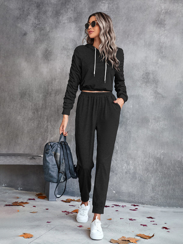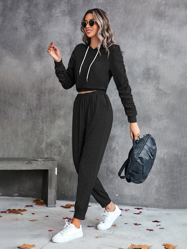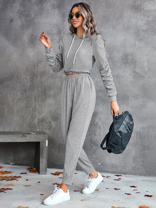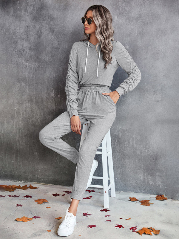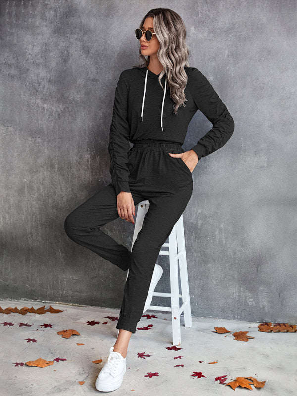 New solid color casual pleated hooded long-sleeved suit