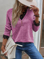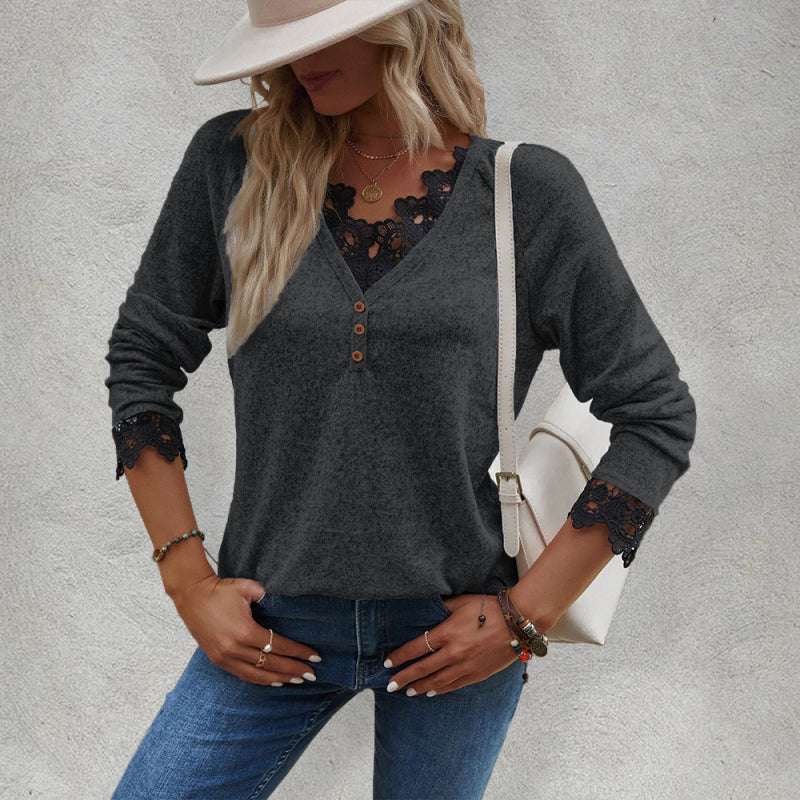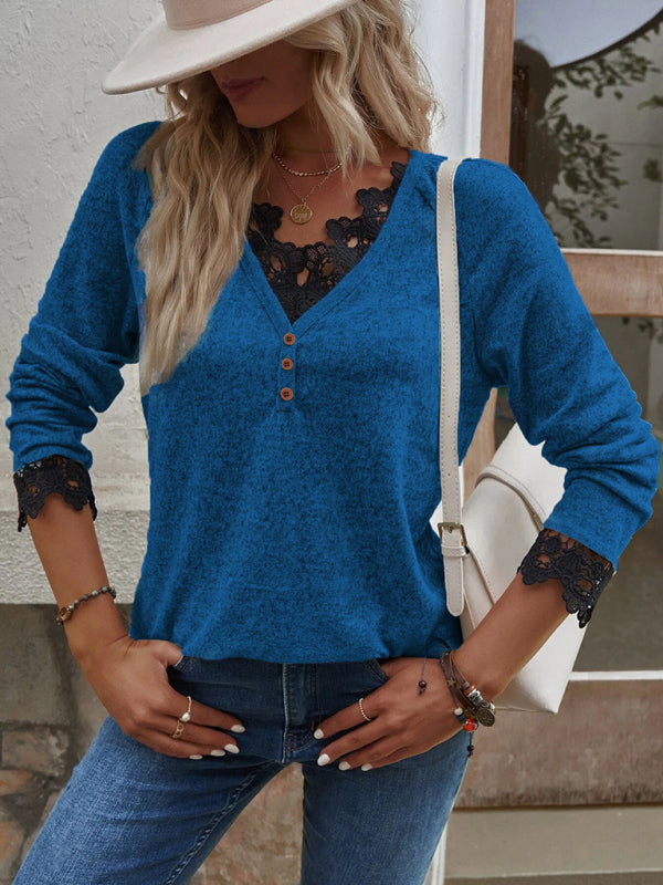 Women’s Solid Color V Neck Button Top Lace Cuffs Henley Top