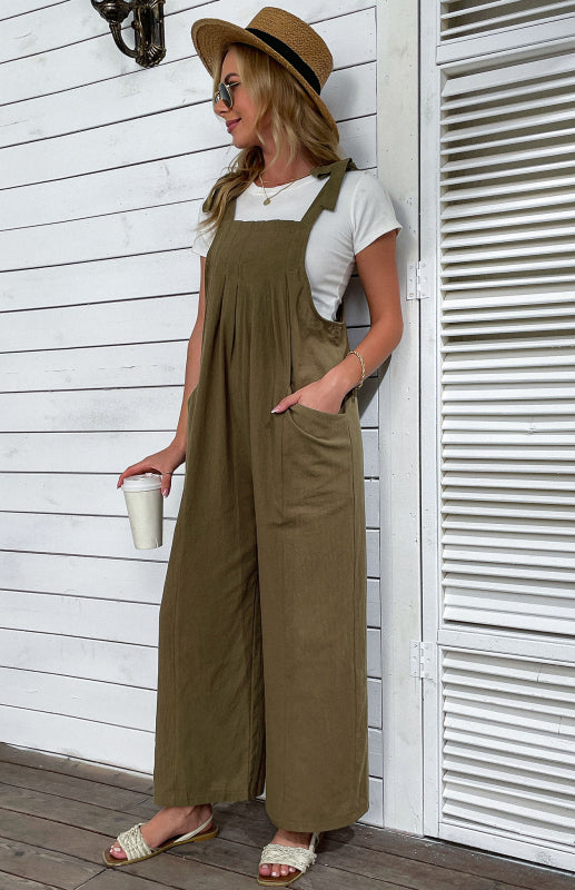 Women's 2022 summer solid color wide-leg cotton and linen overalls
