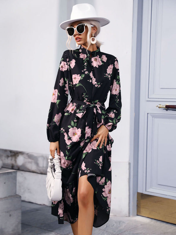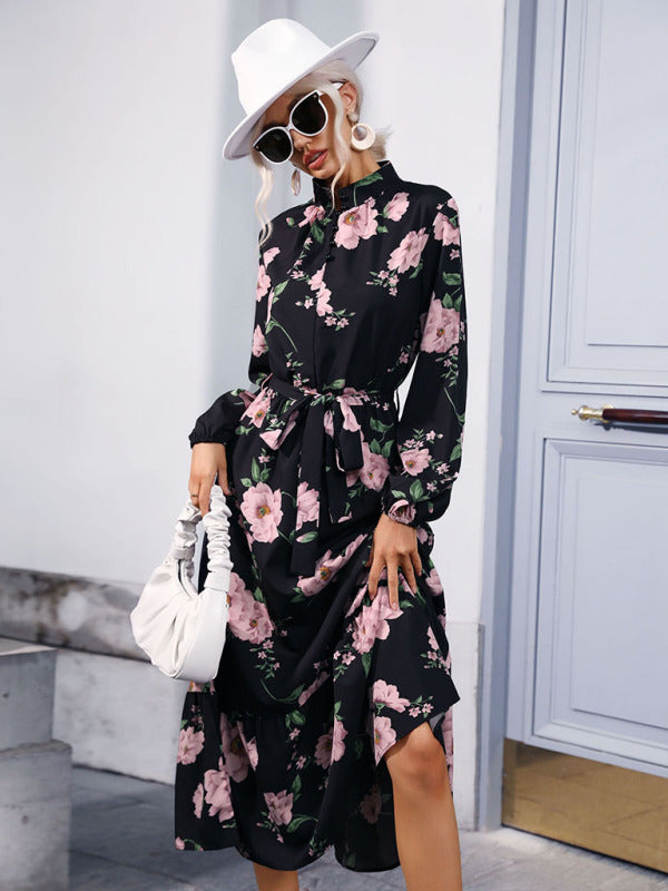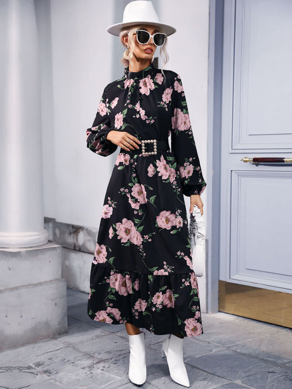 Women's print long sleeve half high neck long dress dress - Black / S está agotado y se enviará tan pronto como vuelva a estar disponible.