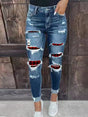 Women's Rip Distressed Lined With Plaid Print Curvy Fit Skinny Jeans