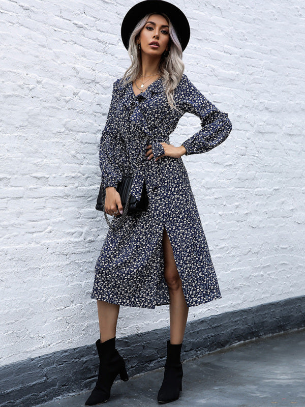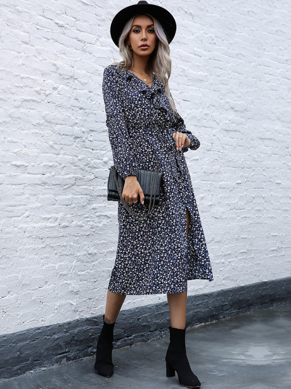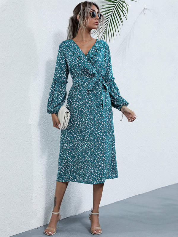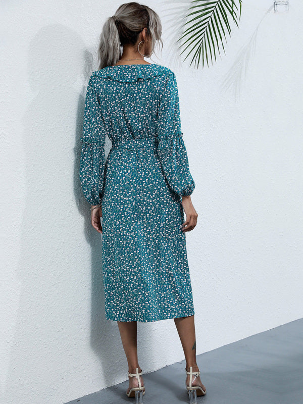 Women's ruffle collar long-sleeved floral dresses - Champlain Blue / S está agotado y se enviará tan pronto como vuelva a estar disponible.